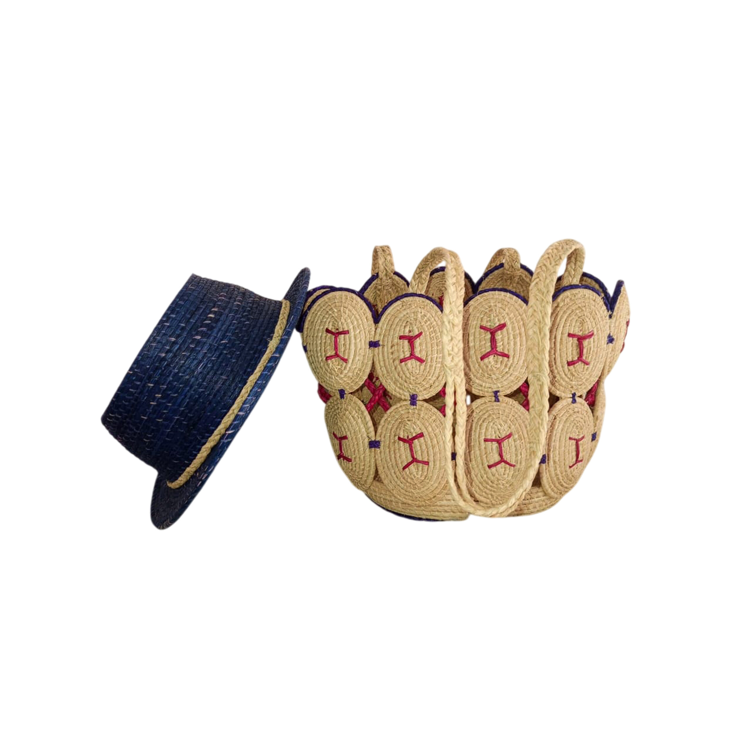 A beautifully handwoven set featuring a navy straw hat and a matching artisanal bag. The bold, circular patterns add a touch of tradition and elegance—perfect for cultural events and stylish getaways.