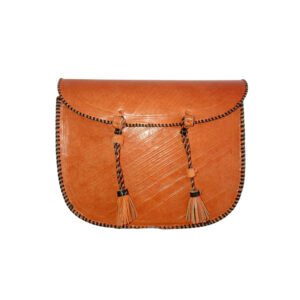 $60.99 Sale Tax0 out of 5Bag is a stunning fusion of tradition and artistry, crafted with premium-quality leather. The bag showcases a rich tan/caramel brown hue, giving it a warm and natural look. It is adorned with meticulous black braided edging and decorative leather tassels, adding to its cultural and stylish appeal.